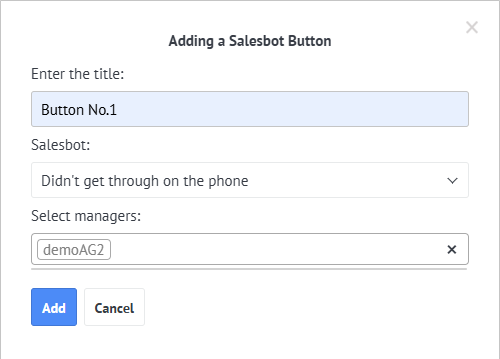 Next, enter the button name, select the salesbot that will be executed when the button is clicked, and choose the managers for whom this button will be displayed.