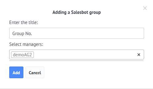 In the modal window that appears, enter the name of the group and the managers, for whom the group will be displayed.